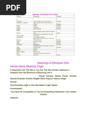 After all we at Top 100 Baby Names Search have tried very hard to provide you with great Ethiopian Baby Names and more. Here comes our selection of 178 Ethiopian Amharic girl names with great meanings these names are of Amharic origin and they make good names for your pretty baby girls. Meanings of Ethiopian Girls names Name Meaning Origin A Abaynesh Like The Nile or You Are The Nile Amharic Abebeche Abebech She Has Bloomed or Blooming Like A Flower Amharic Abeba Flower Amharic Abenet Example Amharic Abigail Father Rejoice Hebrew Abigel Abrinet She.
